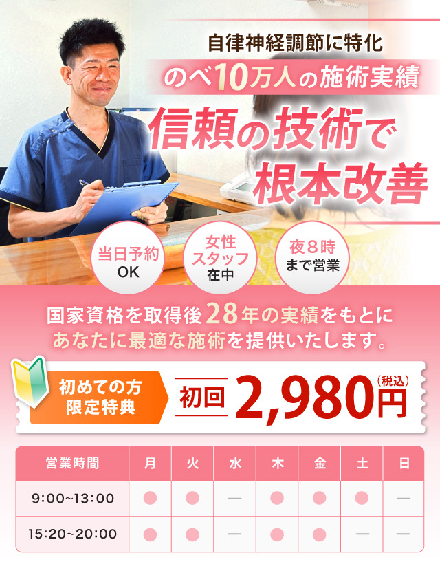 様々な症状の要因となる自律神経の乱れを調節することで、自覚症状の早期緩和、再発防止、生き生きとした身心を作ることを目標に施術を行います。